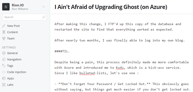 This post focuses on how I got my password back, upgraded Ghost (and Node) on Azure, and some of the things I learned along the way.