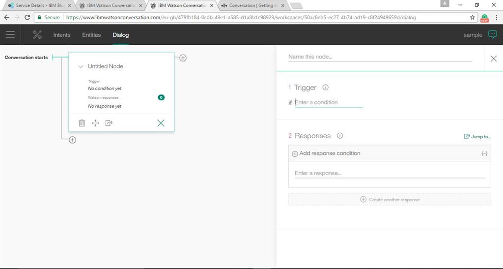 Now, click + button to add new dialog conversation. Here, we need to use Trigger as a configured intent, so my intent name is Hai and Watson response is “Welcome to c-sharpcorner a leading community for sharing technology”.