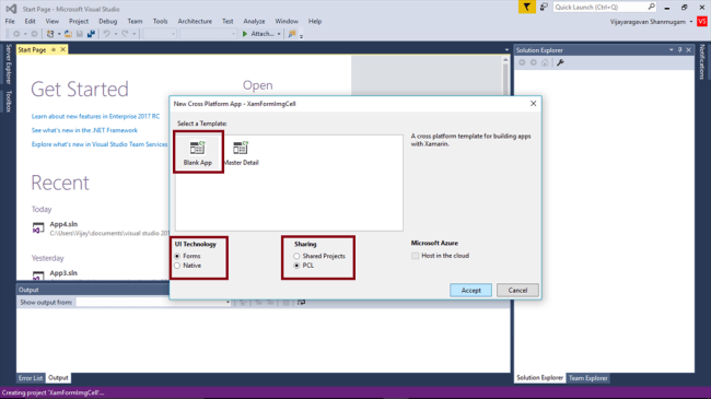 Open Visual Studio 2017 RC. Go to Start -> New Project-> Cross-Platform (under Visual C#->Cross Platform App) -> Give suitable name for your App (XamFormImgCell) -> OK.