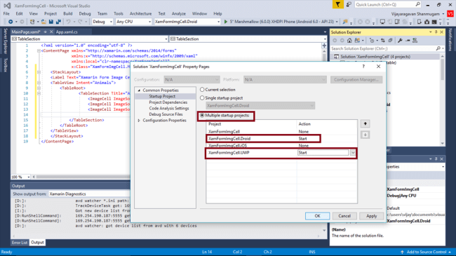 We will test Android and UWP. So, we can set the multiple Startup Projects as XamFormImgCell.Droid and XamFormImgCell.UWP (Universal Windows).