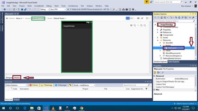 After the process completes, the Xamarin dashboard appears. At the top right, you will see Solution Explorer. There is your application solution. Select application name; extract to resources. The Layout folder appears in which there is Main.axml* file. Double click to open Main.axml file. Then double click on down side left corner appear Source button. Don’t change android version default V23.