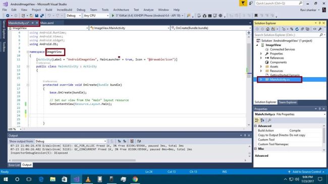 Then, let's go to the Solution Explorer, click on MainActivity.cs. Your application name could be that namespace.