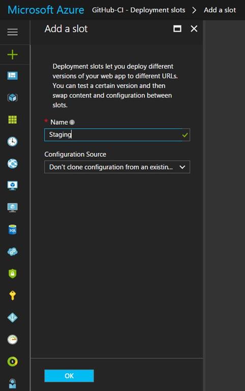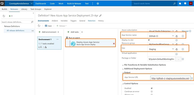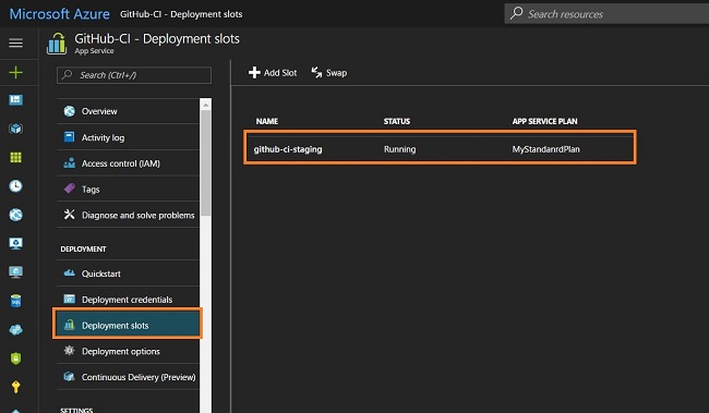 http://github-ci-staging.azurewebsites.net is the URL generated from the deployment slot, which I am going to use in the release definition for the deployment