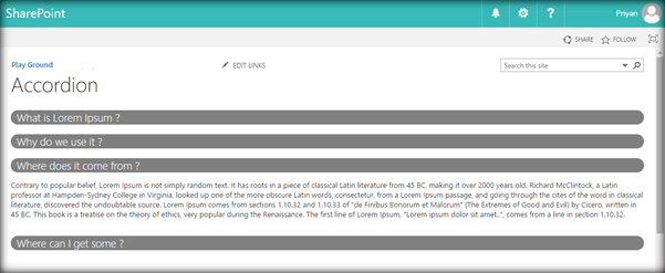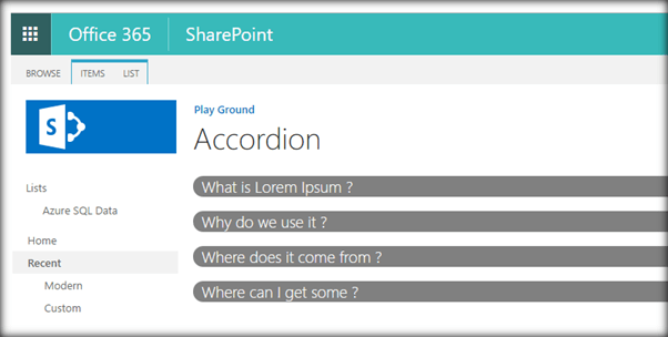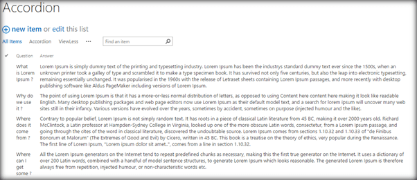 In this walk through, we will see how to convert a SharePoint List View into accordion using Client Side Rendering (CSR). This becomes handy if we want to use SharePoint List to create an FAQ web part or a Question/Answer web part.