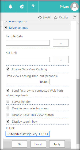 We can save the above code to a js file and upload it to say: Site Assets within the SharePoint Site. We can then go the list view’s edit page by appending “?toolpaneview=2” . In the edit page of the view go to the edit properties of the List view and add the js file in the JSLink section.