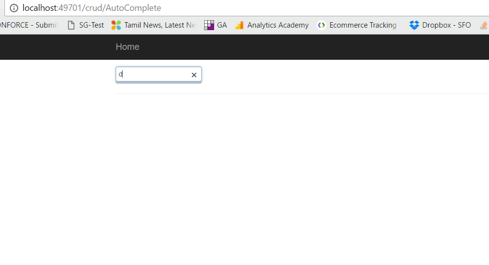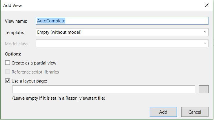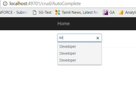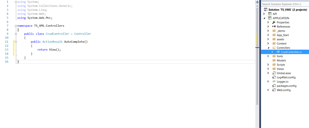 Create MVC Application after the creation of an Application. Create control in the name of Crud and create actionmethod in the name of AutoComplete.