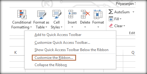 We have to make sure that the developer tab is available in an Excel sheet in order to get started with the development, using VBA. In order to do this, right click anywhere on the tool bar and select customize the ribbon option.