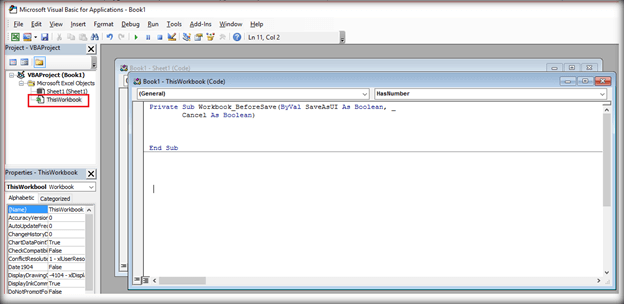 We will be making use of the ‘BeforeSave’ event of Excel Workbook to trigger the validation logic. Thus, click on ‘ThisWorkbook’ to open up the code Window, where we will add the ‘BeforeSave’ method. We will be writing out the entire code within this method, as it will be invoked on the Workbook Save event.
