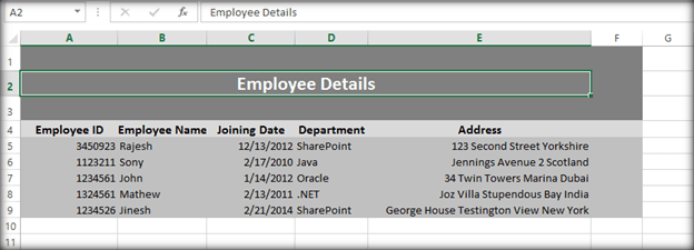 As part of this demo, we will have an Excel sheet that contains the Employee details given below like Employee ID, Employee Name, Joining Date, Department and an Address.