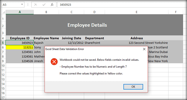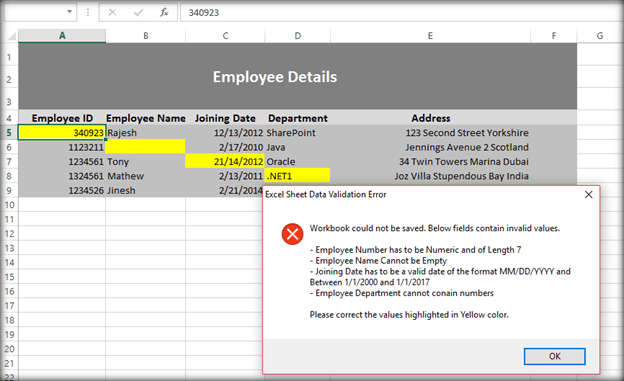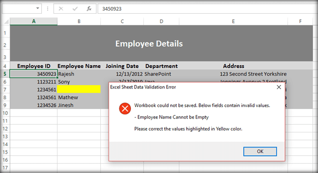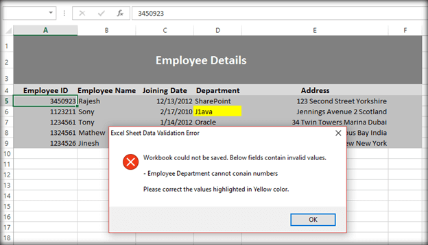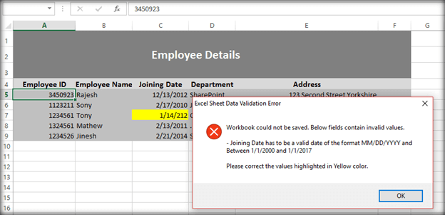 In case of an invalid data in Joining Date, we will get the error message given below while saving the Workbook.