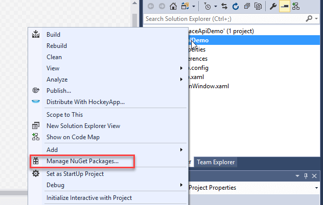 We need to add two packages to our WPF applications. Right-click the Solution Explorer and press "NuGet Package Manager" to add two packages.