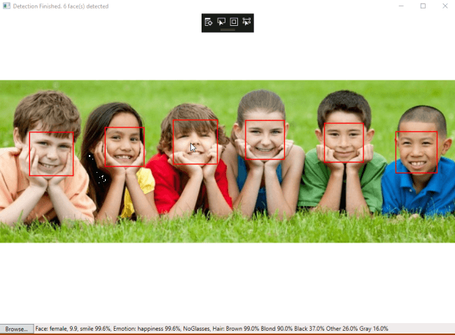 Stay calm for some seconds. The cloud API wants to respond to our images to detect the Faces using red boxes around the faces in the image. Mooving the cursor over the face rectangle, the description for that image shows up in the status bar.