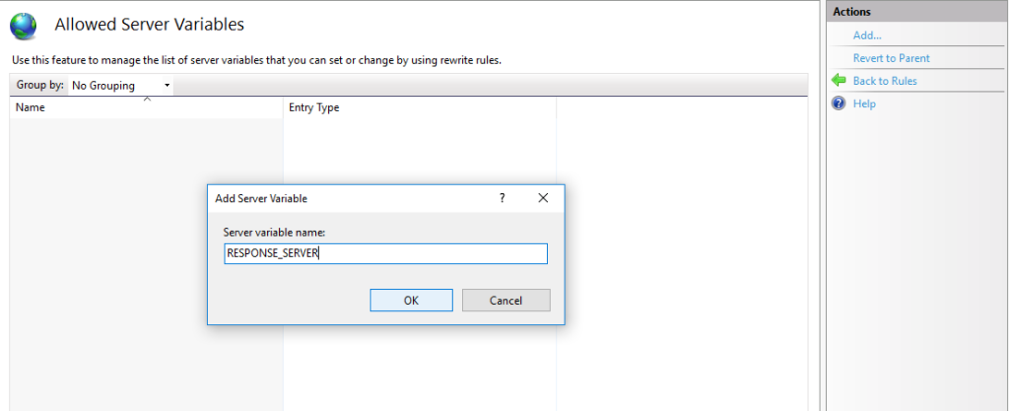 Again, double click on URL Rewrite icon and add Server variable, like in the following image.