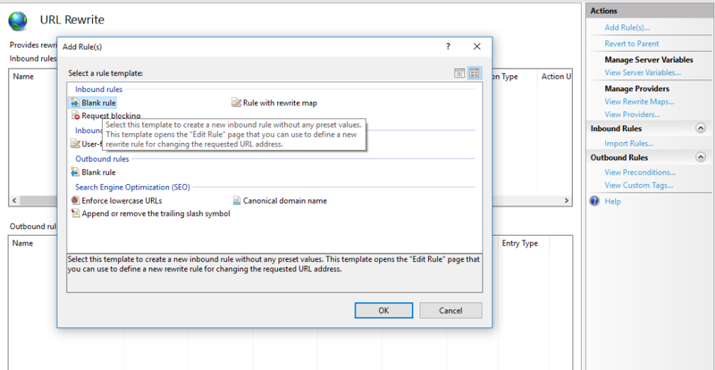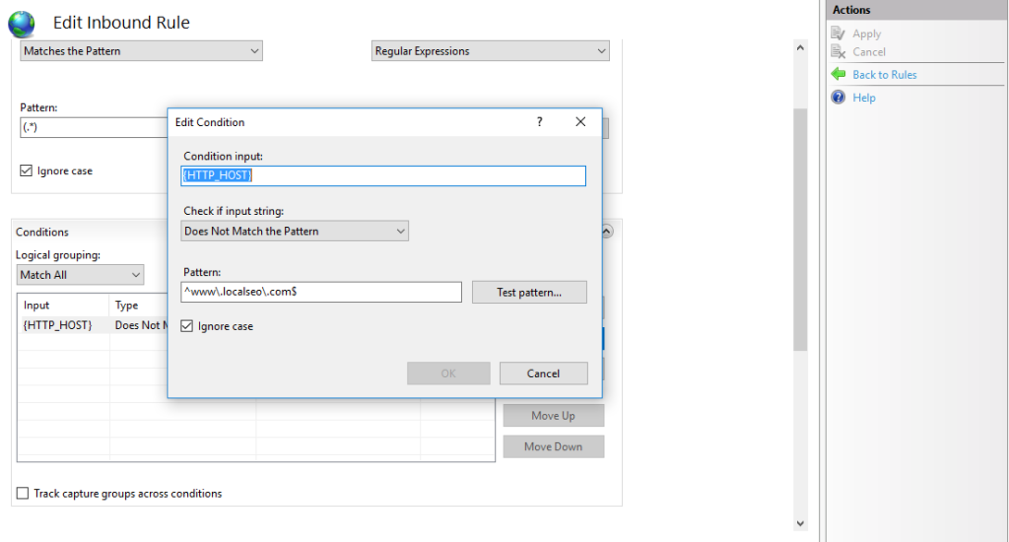 Make sure the bindings are proper with the host name in IIS. Now, create a new inbound rule for Canonicalization of both the IP and the URL, with www.