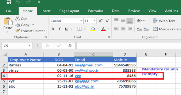 - if (Exceldt.Rows[i]["Employee Name"] == DBNull.Value || Exceldt.Rows[i]["Email"] == DBNull.Value )