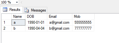 - INSERT [dbo].[Student] ([Name], [DOB], [Email], [Mob]) VALUES (N'a', CAST(N'1990-01-01' AS Date), N'[email protected]', N'555555555')
