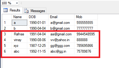 - INSERT [dbo].[Student] ([Name], [DOB], [Email], [Mob]) VALUES (N'b', CAST(N'1990-04-04' AS Date), N'[email protected]', N'777777777')