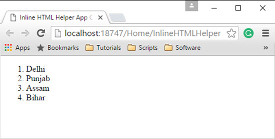 - @InlineHelplerCode.OrderedList(new string[] { "Delhi", "Punjab", "Assam", "Bihar" })