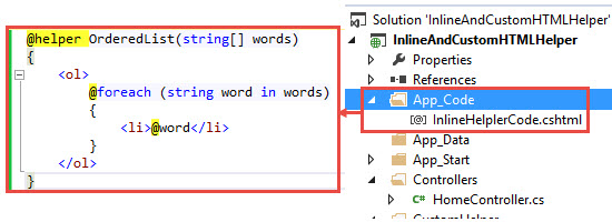 In the code shown above, we created an inline helper method i.e. OrderedList, which takes a string array as an argument and displays each word in an ordered list. We can reuse the inline HTML helpers multiple times on the same view.