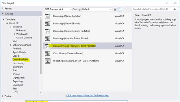Open Run - Type Devenev.Exe and enter - New Project (Ctrl+Shift+N) - select Blank Xaml app (Xamarin.Forms Portable) template.