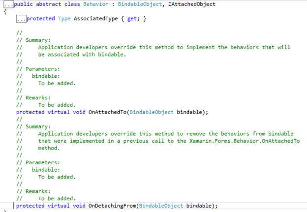 Xamarin.Forms Behaviors are created by deriving from the Behavior or Behavior<T> class, where T is the type of the control (Entry, DateTime, etc) to which the Behavior should apply.