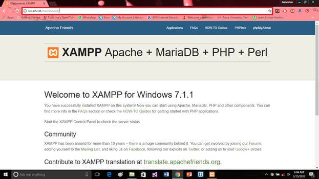 Open your Browser, followed by typing http://localhost or http://127.0.0.1. Afterwards, you will see XAMPP community page.