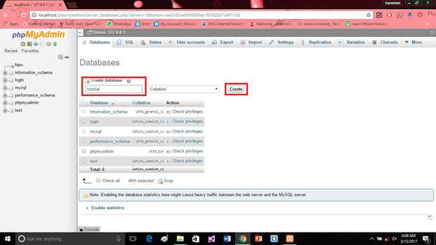 Put the database name as whatever you want. Here, the database name tutorial is given. Click Ceate.