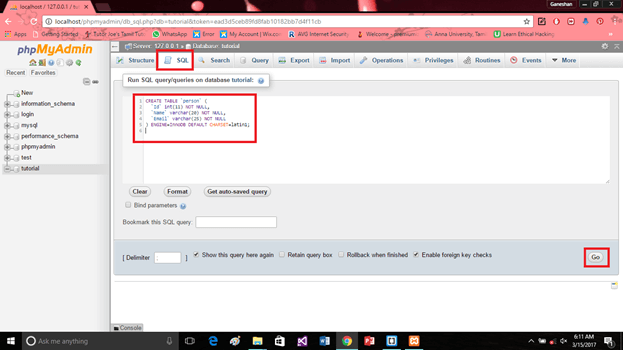 Go to SQL query tab, copy and paste the query given below. Click Go. Afterwards, your table (my table name : person) creates successfully.