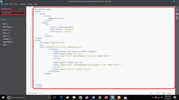 Open the bracket (IDE) and create the index.html file. Copy the code given below and paste into index.html.