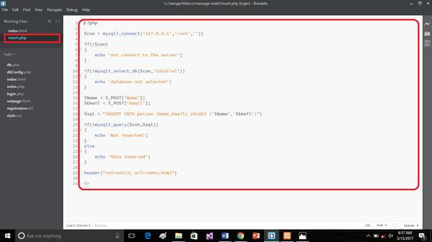 Create the insert.php file. Copy the code given below and paste into insert.php.