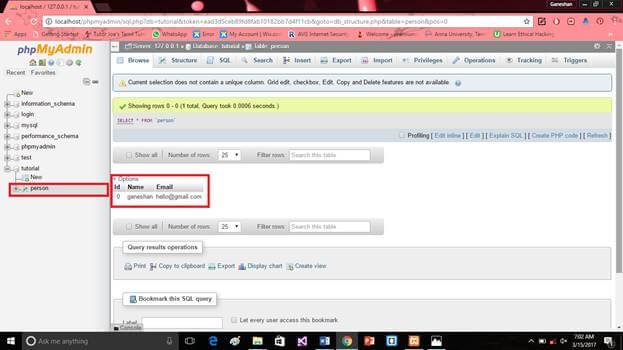Go to the tutorial database. Open the person table.name and an email id was inserted successfully.