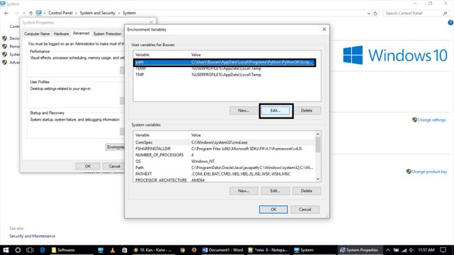 Click Start ->environmental variables->system properties ->Environmental variables.