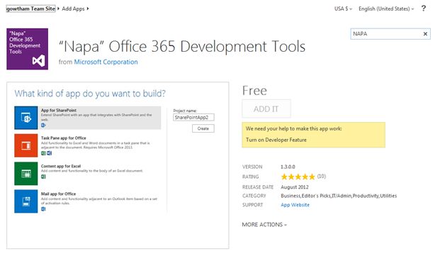 When I tried to add the Napa app for developing apps for SharePoint 2013 online I got the below message. “Turn on Developer Feature” for “Napa” Office 365 Development Tools in SharePoint 2013 online. NAPA office 365 Development tools is a built in office 365 tool from Microsoft to develop the apps for office,SharePoint. NAPA tool is the free version and we can develop a SharePoint hosted App.“Napa” Office 365 Development Tools make it easy to start building apps for Office and SharePoint. Just add the “Napa” Office 365 Development Tools app to your SharePoint Online Developer Site, launch it, and you will be ready to create your first app for Office or SharePoint. For more details about NAPA tool find the below reference, Then I analyzed many blogs to find the solution and it is very simple. To resolve this issue we need a Developer Site. So we need to create a new private site collection with Developer Site as template. Got to the office 365 central admin and create a webapplication and name it DeveloperAPP, Select the Template as Developer site, Then Go to the site Contents and Add an app then chose SharePoint Store, Click add it button. Yes, Napa tool is added in your site.