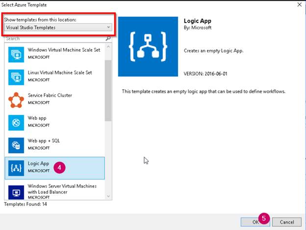 Clicking OK will open Azure Template given below, where you can choose the built-in templates available with Visual Studio for quickly building Azure Services. For this example, select Logic app and click OK, as shown below.