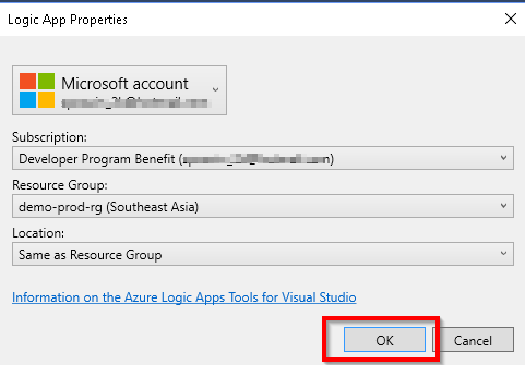 Clicking on the Open with Logic App Designer will open the popup given below to connect to Azure Subscription, where you need to choose your subscription and also choose a Resource Group. Once you choose the Resource Group, click OK button.