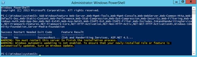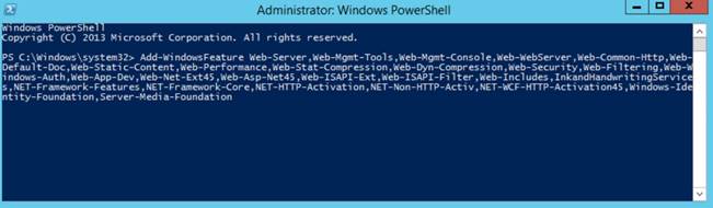 Add-WindowsFeature Web-Server, Web-Mgmt-Tools, Web-Mgmt-Console, Web-WebServer, Web-Common-Http, Web-Default-Doc, Web-Static-Content, Web-Performance, Web-Stat-Compression, Web-Dyn-Compression, Web-Security, Web-Filtering, Web-Windows-Auth, Web-App-Dev, Web-Net-Ext45, Web-Asp-Net45, Web-ISAPI-Ext, Web-ISAPI-Filter,Web-Includes, InkandHandwritingServices, NET-Framework-Features, NET-Framework-Core, NET-HTTP-Activation, NET-Non-HTTP-Activ, NET-WCF-HTTP-Activation45, Windows-Identity-Foundation, Server-Media-Foundation