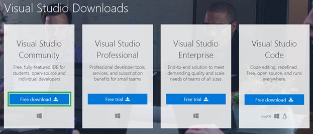 We can download Visual Studio Community Edition 2015 from the following the link. After entering the Visual Studio download page, click “Free download” from Visual Studio Community menu.