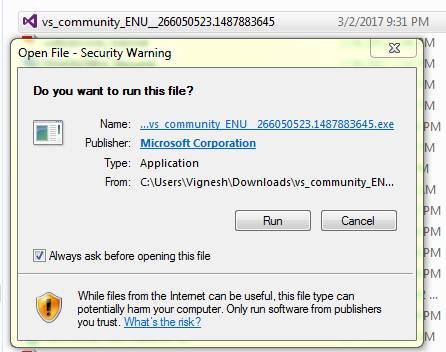 Double click “vs_community_ENU__266050523.1487883645.exe” and click "Run".