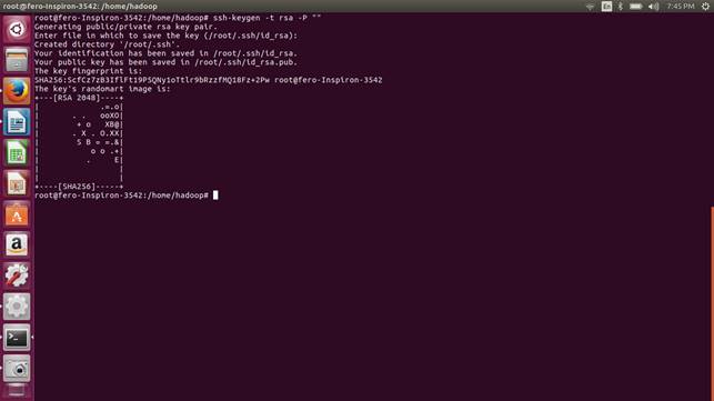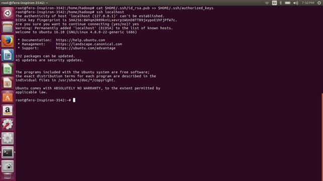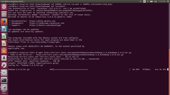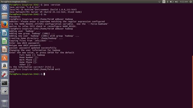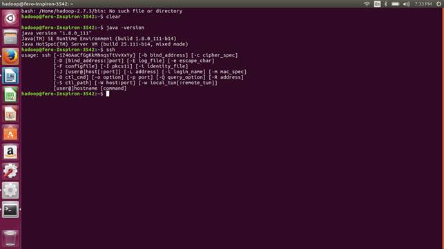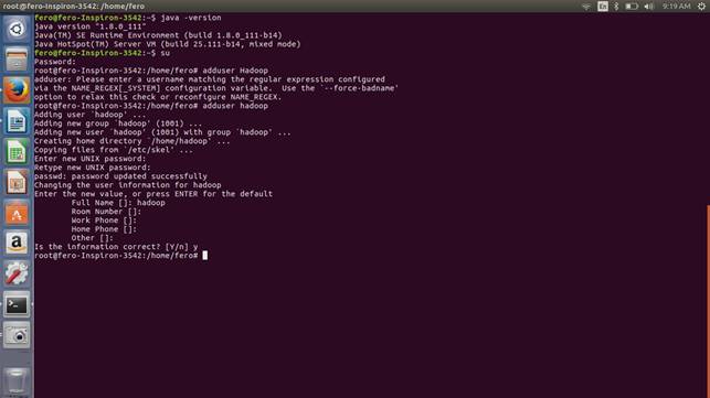 Follow the below steps now. Step 1 Open a new terminal and check if Java is installed on your machine or not. Terminal – Ctrl + Alt + T To find the Java Version: Command java -version So here we have the Java runtime environment on our machine. Step 2 Create a user to install Hadoop in your machine. To create a user you should be in a root account. Login with root account: su Enter the password of the account after giving su For creating a new user: adduser username (in my case i will name it as hadoop) Enter the password for the new user. Enter once again to confirm the user. Enter the full name for the user. Enter the room number, work phone, home phone, and other information. Give confirmation once again by giving Y. And now you can exit from the root account using exit command. Click on settings at the top right corner you can find the username over there. And now we are in a new user account of Hadoop. You can also check whether Hadoop is installed on your machine or not by using the below command: hadoop -version Open a terminal and check the Java version now using the below command: Command java -version Install SSH SSH – ssh is a client program added; it's a command that we will be using in Linux to connect with remote machines. Next we need sshd which will be running on the server and will allow clients to connect to the server. Use the below command to install ssh: Note you should be a root user Command sudo apt-get install ssh Create and Setup SSH Certificates Hadoop need SSH to connect to its local host and nodes. So here we will be allowing SSH to run on the machine with public key authentication. SSH normally needs a password to access its node, here we will be removing it by providing a SSH certificate using the below commands. Command ssh-keygen -t rsa -P "" Note Leave the file name blank over here. Use the below command now to list out the newly created keys so that hadoop will not ask for any keys further. Command cat $HOME/.ssh/id_rsa.pub >> $HOME/.ssh/authorized_keys You can now check if the SSH Key works with the help of the below command: Command ssh localhost Give “Yes” for connecting. Installing Hadoop Now install Hadoop using the below command, this will download Hadoop to your machine. Commands :~$ wget http://mirrors.sonic.net/apache/hadoop/common/hadoop-2.6.0/hadoop-2.6.0.tar.gz :~$ tar xvzf hadoop-2.6.0.tar.gz