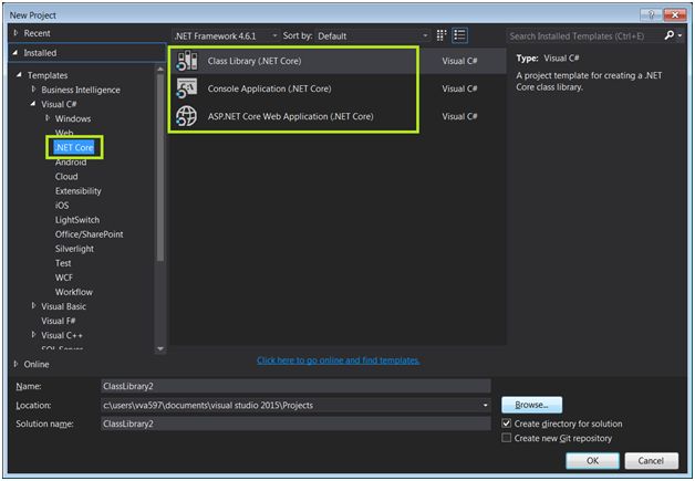 When you launch Visual Studio 2015, you will be looking for “.NET Core” templates, as shown in the image below: