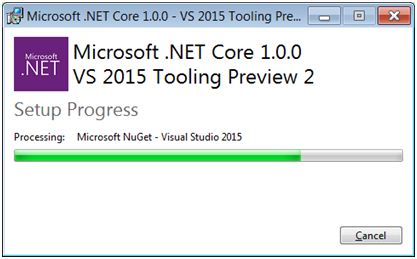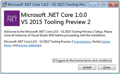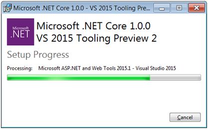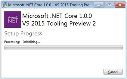 Once you have installed Update 3 and downloaded the DotNetCore.1.0.0-VS2015Tools.Preview2.Exe, just launch it and you will see the setup proceeds, going through the following steps: