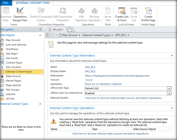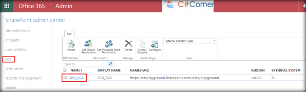 If we go to SharePoint Online Admin Center, we can see the external content type, which we had recently created in BCS section.