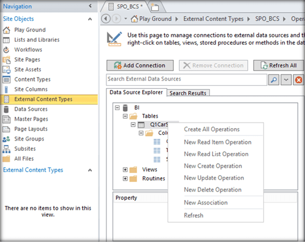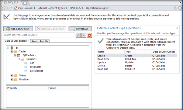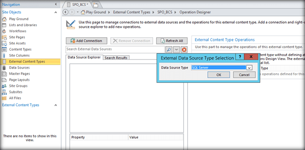 Select click here to discover external data sources and define operations link. Select Add connection from the resulting Window. Select the DataSource as SQL Server and click OK.