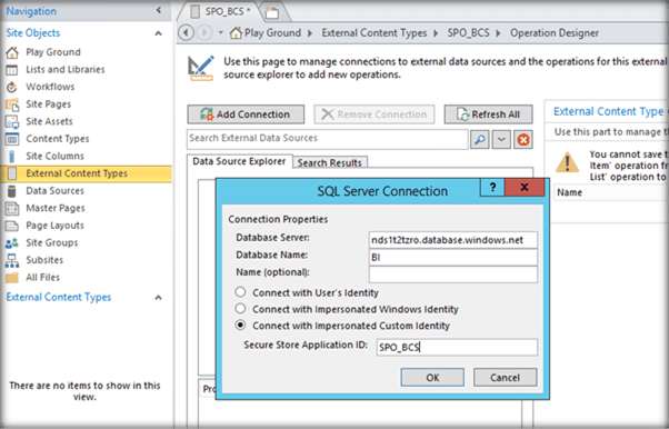 We will make use of Secure Store target Application to use the saved credentials to connect to Azure SQL DB. The Secure store target Application, which we have created here is SPO_BCS.