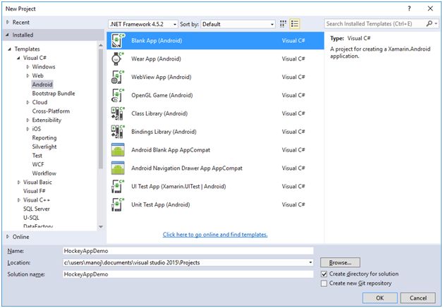 - Select the Blank App (Android) project template and enter the name of the project as HockeyAppDemo and click on Ok button. After clicking on Ok button, a blank Xamarin Android application will be created.