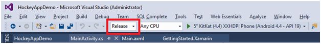 - To create the .apk file for our application, change the Solution Configuration for our project from Debug to Release mode as shown below (F: 14)