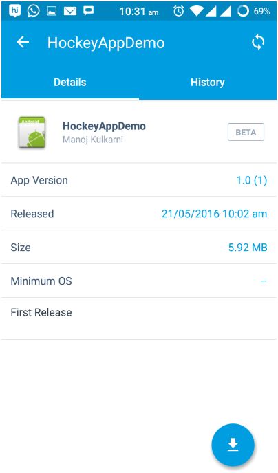 - As we can see in above image, we can see all the details of our application like version number, app size, release notes etc. We can download the application using the blue floating action button at the bottom of the screen as shown in above image. Once it is downloaded, we can install and start testing the application.