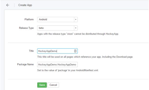 Enter the title and package name we got from step 6. After filling all the detail, click on save button. Hockey app will create our application. After some processing, we will get a page where our App Id is displayed as shown below (F: 8).
