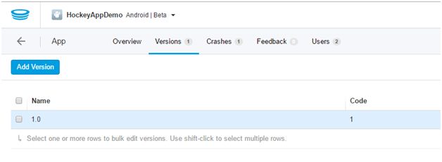 - Now let's go back to Hockey app website to upload our .apk file. To upload .apk file to Hockey app, select the Versions option. It will display all the versions of our application as shown below (F: 16)