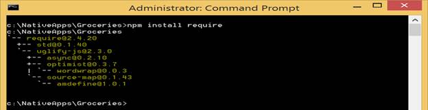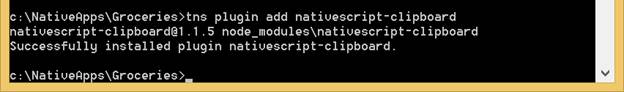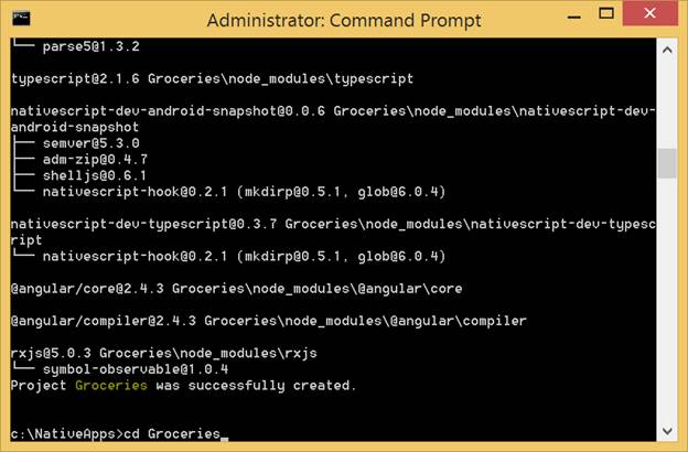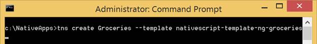 - Create new native script app using existing template (groceries). For this, open the command prompt, browse root folder for the project, and then type